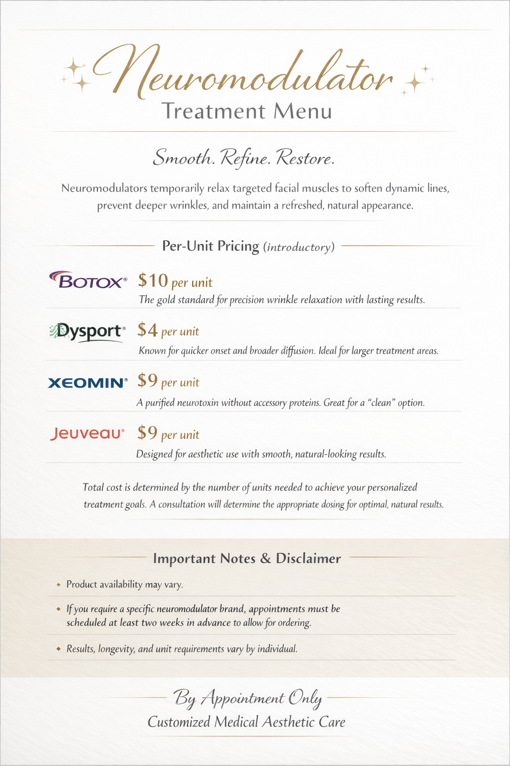 If you require a specific neuromodulator brand, appointments must be scheduled at least two weeks in advance
